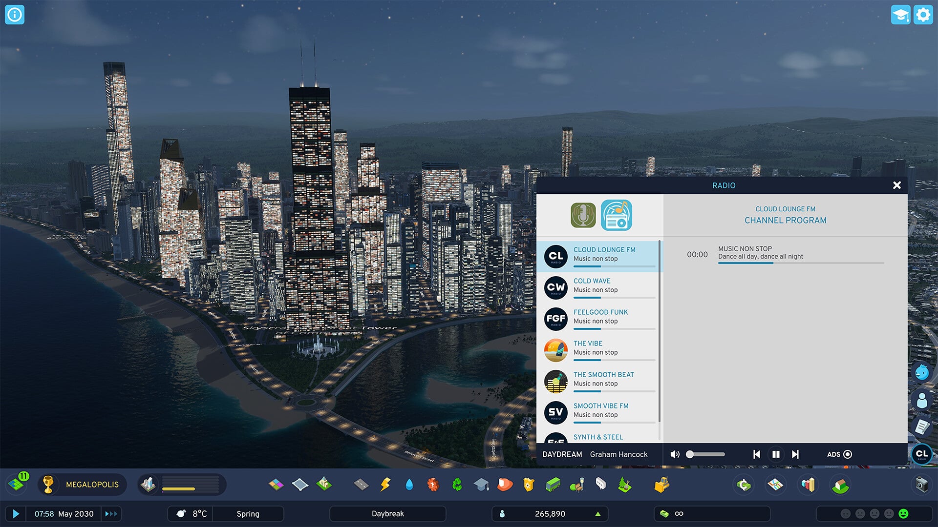 Cloud Lounge FM adds a new in‑game radio station offering around 60 minutes of music: a mix of ambient and lounge‑style tracks plus DJ voice‑overs. The station is aimed at creating a relaxing, sky‑high, modern‑city vibe — described by its creators as the perfect soundtrack for building sleek, high‑rise districts or cosmopolitan cityscapes. It pairs especially well with the game’s “vertical” building options, supporting players who want to build modern, metropolitan cities.