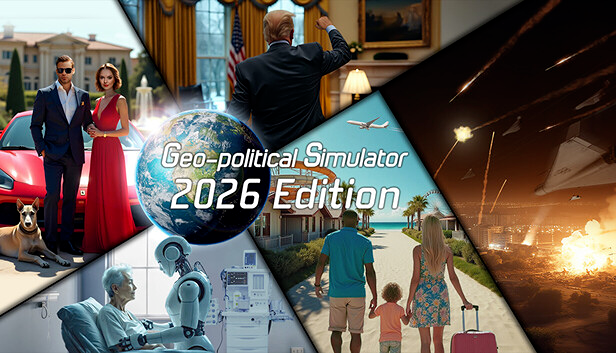 As a simulation, Geo-Political Simulator 2026 Edition lets players assume roles ranging from head of state to opposition leader or corporate CEO, managing political, economic, military, social, and environmental systems across a detailed global dataset. This edition highlights new mechanics such as a tourism simulation, party strategies with regime censure mechanics, personal wealth management for leaders, a European defense/army feature, and simulations of AI and robotics impacts on employment and policy. Scenarios can be started in either 2025 or 2026, offering different contemporary starting contexts within the same release.